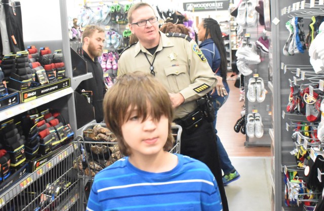 Above, New Kent deputy Heath Jenkins escorts a kid down an aisle for clothing as part of New Kent’s “Shop with a Cop” held Saturday morning at the East Nine Mile Road Walmart. In conjunction with Henrico’s Fraternal Order of Police, families and kids are taken on shopping sprees to brighten up the holiday season. Below, (l to r) J. Joe McLaughlin III, Brandon Jenkins, and Sheriff J. Joe McLaughlin Jr. (far right) are joined by New Kent Superintendent of Schools Brian Nichols (center), along with students to brighten up their holidays.Robb Johnson photos