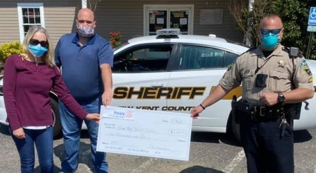 New Kent Rotary Club representatives Lee Muslin and Christopher Tripp (left) present New Kent Sheriff’s Office Corporal Gerald Simpson a $1,000 donation for personal protective equipment to the auxiliary department. Funds for the donation were raised through tree sales and other fundraisers.