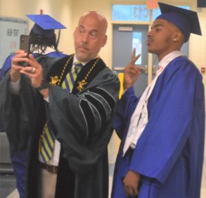 New Kent Superintendent of Schools Brian Nichols (left) grabs a selfie with outgoing graduate Jason Hall (right).