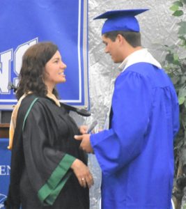 On stage, New Kent graduate Nathan Staskiel (right) prepares for a hug from mother and school board chairwoman Andrea Staskiel after his name is called.