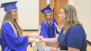 At the conclusion of graduation ceremonies, Natalie Filipowicz (left) is excited to receive her diploma and shirt to commemorate the occasion.
