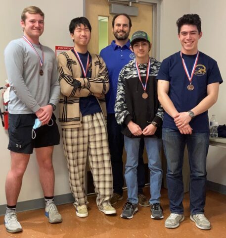 New Kent and Chesapeake Bay Governor’s School students You Gao (second from left) and Aaron Sweeney (far right) placed third in the Tidewater Physics Olympics hosted by Rappahannock Community College. The teams competed in various physical challenges, demonstrating a combination of energy and innovation throughout the competition.