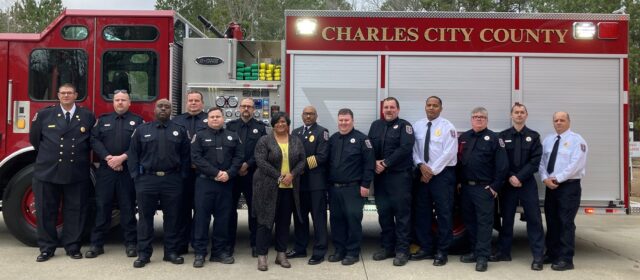 Charles City County Fire & EMS hosted a Pushing In and Pinning Ceremony on Feb. 22. The crew pushed in a new 2021 E-One Typhoon pumper into Station Three. The Pinning In ceremony recognized Lieutenant Robert Glubke, Firefighter Charles Lawrence, and Firefighter Justin Bulifant.