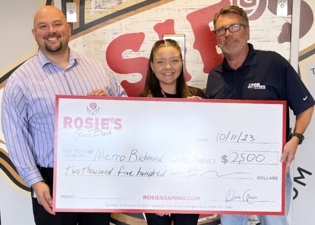 Dan Cuic (left) and Trina Guzman (center) of Rosie’s Gaming Emporium at Colonial Downs in New Kent, present a check to Mark Phaup (right) of Metro Richmond Crime Stoppers. The $2,500 donation is used to assist the Central Virginia area in providing resources to solve crimes.