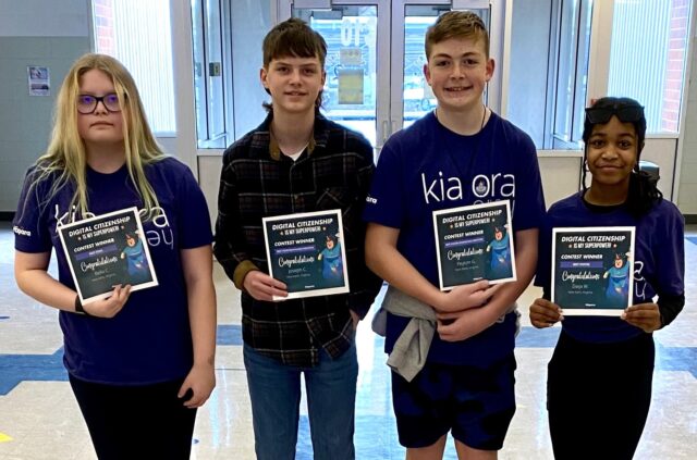 Four New Kent Middle School students received awards for winning the “Digital Citizenship is my Superpower” contest sponsored by Hapara. The students were tasked with creating a media in their preferred category by using a digital platform. Winners are (l to r) Bella Carswell (Best Song), Joseph Cottrell (Honorable Mention-Best Video), Peyton Grove (Honorable Mention-Best Poster), and Daija Wallace (Best Poster).