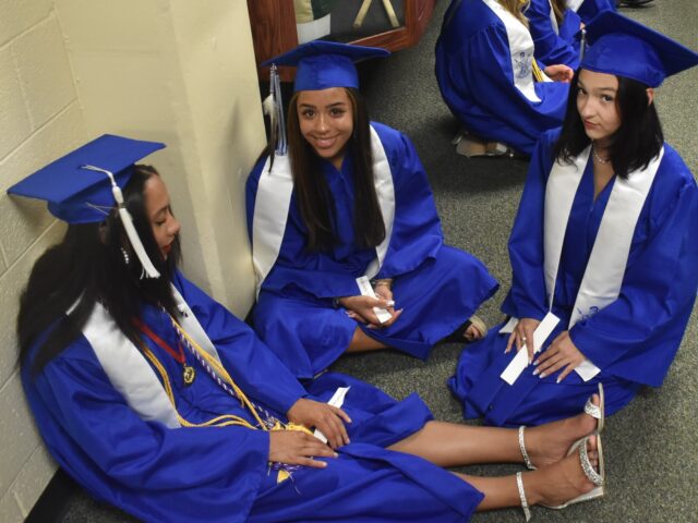New Kent graduates (l to r) Kyra Jones, Gabriella Adkins, and Alena Pappas recollect their high school careers as they wait for the grand processional.