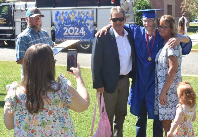 After the ceremony, Cody Riggs poses with family members as he celebrates his graduation after already receiving his certification in small engine and marine repair from Bridging Communities Career and Technical School.