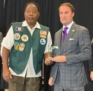 Chickahominy Area Triad President Danny Green (left) accepts an award from Virginia Attorney General Jason Miyares (right) after the organization is recognized as the Outstanding Virginia Triad for 2024 at the Oct. 10-11 statewide Triad Conference in Williamsburg. Serving both Charles City and New Kent, the Chickahominy Area Triad was recognized for its devotion, dedication, and outstanding services to the senior community.