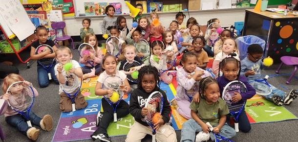 QuickStart Children of Virginia (QCV) presented a $1,300 from the United States Tennis Association (USTA) Mid-Atlantic Foundation to purchase equipment for preschool classrooms at Charles City Elementary School and provide books for its “Racquets for Reading!” initiative. Equipment included a 19-inch racquet, red foam balls, traffic cones, and a 10-foot portable net.