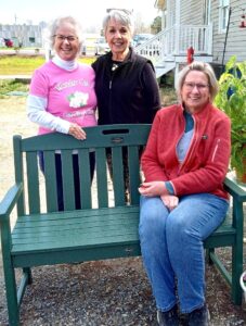Wonder City Garden Club representatives Nancy Washabaugh and Diane Cook (left) donated a bench to Promise Land Storehouse in Charles City (accepted by Jackie Stewart, seated) during a recent presentation. The bench was constructed from more than 1,000 pounds of recycled plastic material.