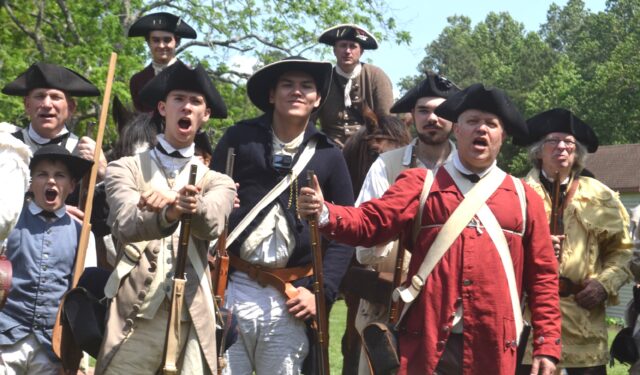 Militia members and cavalrymen as part of a reenactment at The Ordinary in New Kent hosted by the New Kent Ordinary. The event marked the 250th anniversary of Patrick Henry’s “Liberty of Death” speech given at St. John’s Church in Richmond. Among activities for families included a horse-riding seminar for children, drilling exhibitions, and military artifacts on display.Noah Kennedy photo