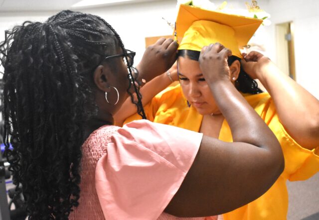 Kayley Lynch receives a helping hand from high school English teacher Deja Phillip as final adjustments are made on her cap.