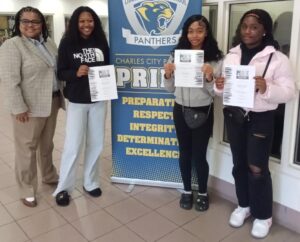 New Kent County Lions Club announced the winners from Charles City High School as part of their annual Peace Poster contest. Pictured are (l to r) Charles City High School Principal Anita Harper, MacKenzie Tyler, Amirah Dobson, and Brielle Key. The posters are on display at Heritage Public Library.