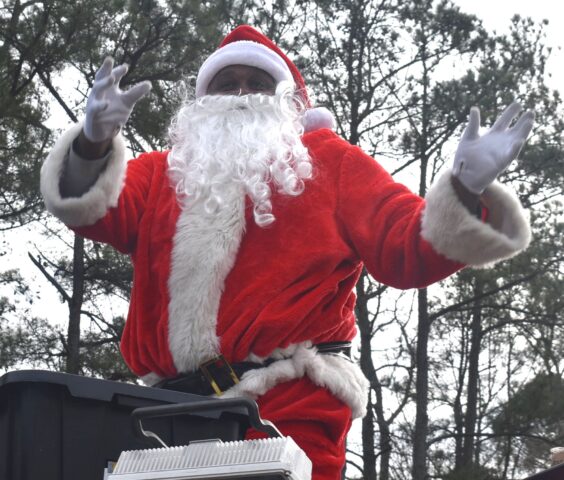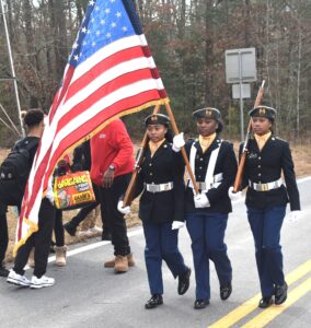 Above, Santa Claus waves to girls and boys from atop a fire truck as part of his visit during Charles City County’s Annual Christmas Parade Saturday morning. Girls and boys of all ages lined up alongside Courthouse Road to ring in the holiday season through music, floats, displays, and entertainment. Below, a train sponsored by St. John’s Baptist Church chugs along the parade carrying very precious passengers. At bottom, Charles City High School’s JROTC Panther Battalion Color Guard leads the way to kick off the festivities. More than 100 photos from the event can be viewed on our photo gallery at www.nkccnews.com.Robb Johnson photos