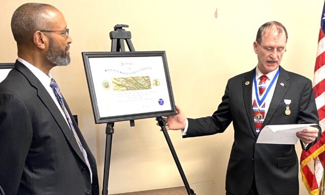 The Abraham Brown Chapter of the Virginia SAR has been chartered to serve New Kent and Charles City County. Named after Abraham Brown, a free African American farmer and landowner from Charles City, the charter welcomed 24 charter members with the organization’s goal to promote historical education, support youth programs, encourage civic engagement, and preserve stories of men and women who shaped the early history of New Kent and Charles City County. On hand to accept the recognition of the charter is Kevin Brown (left), who is the sixth great-grandson of Abraham Brown.