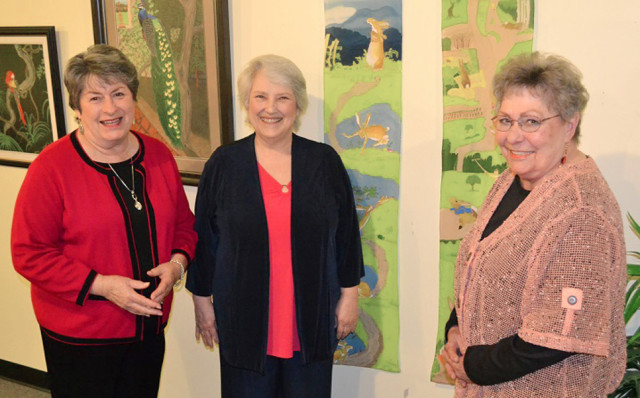 New Kent artist Lucy Sawyer (right) stands by the tapestries she has donated to Heritage Public Library. At far left is one of her students, Sue Leary, standing next to library director Barbara Winters.Andre' Jones photo