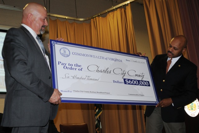 Charles City Board of Supervisors chairman Bill Coada (left) accepts a $600,000 grant check for upgrading the county's telecommunications from state Secretary of Commerce and Trade Maurice Jones.