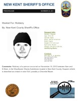 New Kent Sheriff’s Office has released a composite sketch of an individual who is suspected in an armed robbery in the Woodhaven Shores subdivision of the county on Nov. 16. The individual is described as an African American male, ranging from age 25-35. He is measured to be at least six feet tall, weigh between 225-250 pounds, and has a heavy build. The suspect was last seen leaving the scene in a black colored SUV, possibly a Chevrolet Blazer. If you have any information, contact Sgt. Mehalko at New Kent Sheriff’s Office at 966-9500 or Crime Stoppers at 780-1000.
