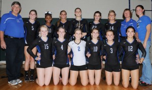 New Kent’s Lady Trojans pose with their Region I volleyball tournament runner-up trophy. Kneeling (l to r) are Katie Ilch, Rachel Byers, Skylar Cossaboon, Paige Simpson, Olivia Foster, and Gina Sledd. Standing are assistant coach Stuart Burnett, Ashley Pierce, D’aysa Jones, Karley Allen, Kelsey Stanbro, Brianne Wayman, Jena Williams, head coach Cyndi Burnett, and assistant coach Ashton Wallace. Next, Jena Williams (14) celebrates while Ashley Pierce hugs teammate Kelsey Stanbro (13) after Stanbro’s block provided the winning point to propel New Kent past Courtland and into the Group A state volleyball tournament. Afterwards, New Kent’s Olivia Foster makes a play on a Courtland shot in front of the Lady Trojan bench. At bottom, Lady Trojan Paige Simpson lunges for a Jamestown shot in last Saturday’s Region I final.Alan Chamberlain photos