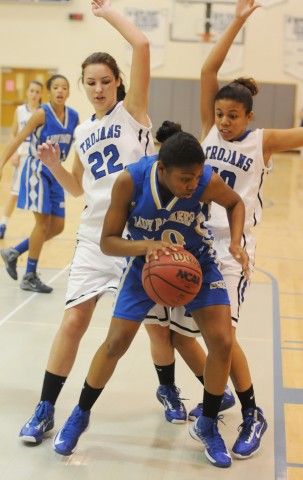 Lady Trojans Mariya Whitesides (22) and Kirsten Gipson trap Smithfield’s Dexedre McGee after McGee grabbed a rebound.Alan Chamberlain photo