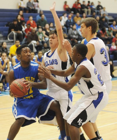 A triple team by New Kent’s Blake Kelly, Jamar Murray, and Travis Claytor stands in the way of Charles City’s Antonio Harris this time, but Harris went on to scorch the Trojans for 42 points.Alan Chamberlain photo