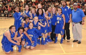 Charles City’s Lady Panthers are all smiles after they defeated the ARGS Lady Dragons 61-58 in the Tri-Rivers District tourney championship. Team members are (kneeling, l to r) Ke’Ara Jones, Jessica Hill, and Hailey Holmes. Behind them are (l to r) Mary Black and Cheyenne Davis. Standing (l to r) are Adrienne Miles, Kayla Otey, Sara Whitehead, Taylor Bradby, Katherine Vinson, Meryah Bates, assistant coach Lauren Wood, Sydney Richard, head coach Vashaun Otey, and team manager Jermaine Johnson. Not pictured are team members Myonka Boyd, Santia Smith, and Adri Taylor.Andre' Jones photos