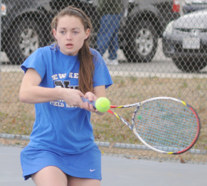 Clare Morris (above) and Britta VanderPoorte (below) return shots during New Kent’s March 27 tennis match with Lafayette’s visiting Rams. Lafayette won 8-1. Singles: Bryant (L) d. Morris 6-4, 2-6, 1-0 (12-10); Bland (L) d. VanderPorte 6-2, 6-1; Utne (L) d. Katie Ilch 6-1, 6-0; Schweitzer (L) d. Gina Sledd 6-2, 7-5; Hinders (L) d. Brianne Wayman 6-1, 6-2; Cassie Drain (NK) d. Trueblood 6-4, 6-2. Doubles: Bryant-Utne (L) d. Morris-Sledd 8-4; Bland-Trueblood (L) d. Vanderport-Wayman 8-3; Schweitzer-Hacher (L) d. Ilch-Drain 8-1. New Kent is 3-1, 0-1 in Bay Rivers District play.