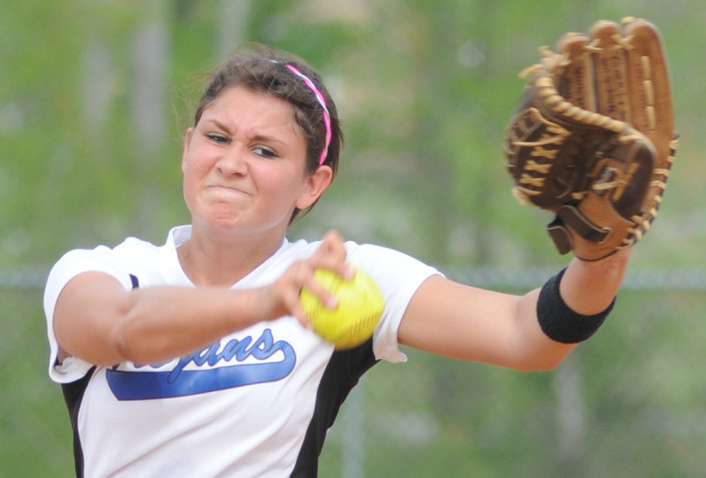 Lady Trojan pitcher Marisa Bush goes into her delivery on the way to firing a perfect game against Lafayette.Alan Chamberlain photo