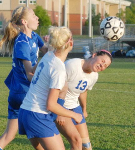 NK’s Ashley Pierce heads the ball in front of teammate Leigh Cargill and York’s Hanah Elford.Alan Chamberlain photo