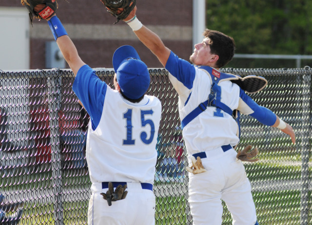 NK first baseman Trey Cox (15) and catcher Nick Valentino leap to snare a Tabb foul, but the ball fell just beyond the fence and their reach.Alan Chamberlain photo