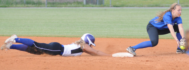 Lady Trojan base runner Brittany LaPrade dives safely back to second base before York second baseman Hannah Hautz can register an out.Alan Chamberlain photo