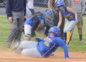 CC softball By Andre Jones | May 8, 2013 4:10 pm Charles City’s Mary Adkins is able to slide safely under the tag of Surry catcher Lexus Holloway to start a fifth inning rally.Andre' Jones photo