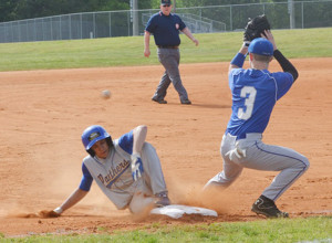 Charles City’s Avery Jones slides safely into third as the ball eludes Cougar third baseman Matthew Keller.