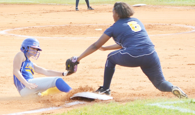 Lady Panther Caylin Stewart slides into third safely underneath the tag attempt of Lady Bronco Candace Gibbs.Andre' Jones photo