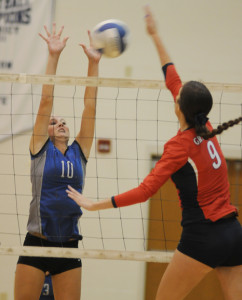 Lady Trojan Millie Rudolph (10) leaps for a blocking attempt on a spike by Grafton’s Kendall Mahony.
