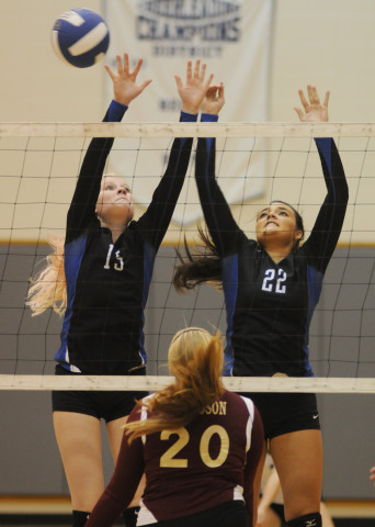 Lady Trojans Katie Ilch (15) and Madison Beasley (22) leap to double block a kill attempt by Poquoson’s Kaylei Haney.