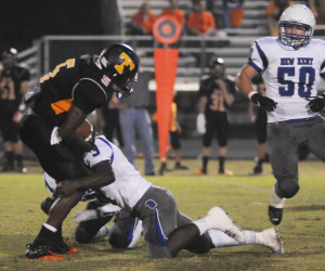 Vick rushes to help teammate Davion Barnes stop a Tabb ball carrier.