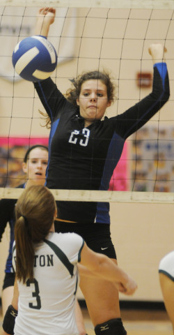 DSC_7655 By Andre Jones | November 6, 2013 5:28 pm Lady Trojan Brianne Wayman watches as her block finds a soft spot in the Bruton defense.Alan Chamberlain photo