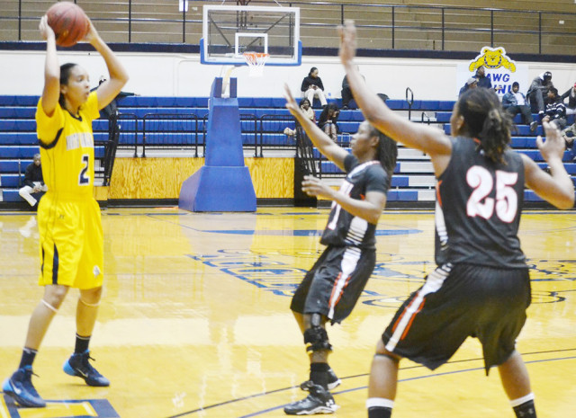 Former Charles City Lady Panther Deborah Smith (left) tries to deliver a pass between former high school adversaries Roslyn Presley (25) and Raechaun Edwards.Andre' Jones photos