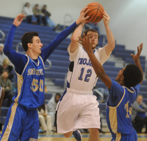 New Kent's Tommy Hale leaps between a pair of Smithfield defenders to pass off to a teammate.