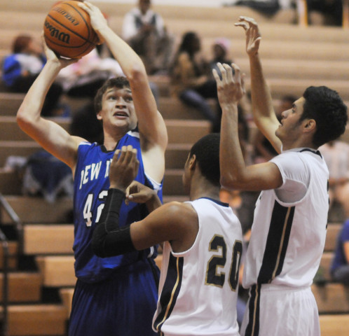 DSC_1782 By Andre Jones | February 21, 2014 11:40 am New Kent's Jason Whitlow looks to get off a shot over the defense of Lafayette's C.J. Miller (20) and Mark Rivera.Alan Chamberlain photos