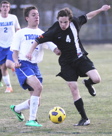 DSC_3848 By Andre Jones | April 25, 2014 4:03 pm New Kent's Christian Lysek engages in a battle for the ball with Tabb's Nate Jacobson (4).Alan Chamberlain photo