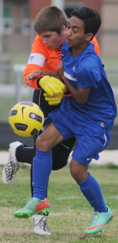 Trojan keeper Richard Flournoy (in red) tangles with York's Marvin Faktes in front of the Trojan goal. Flournoy prevented Faktes from scoring.Alan Chamberlain photos