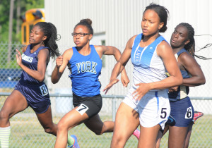 DSC_5521 By Andre Jones | May 20, 2014 10:50 am Sprinting around curve, Lady Trojan Adrienne Goodlet has already made up the staggered start on the field on the way to winning the 200 meters.