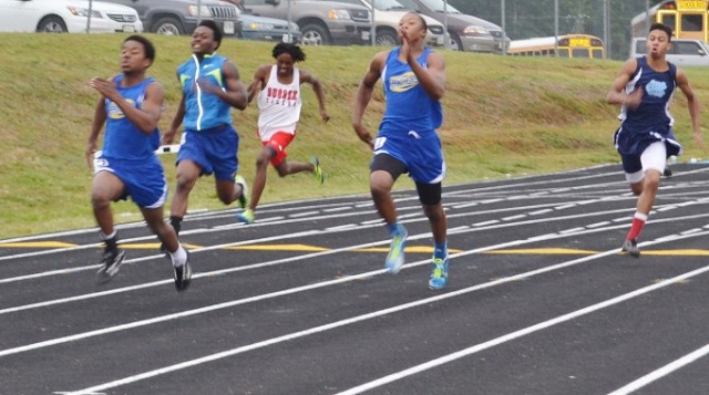 Charles City teammates Mason Jefferson (left) and Jaquane Wyatt (second from right) pull away from competitors in the second heat of the boys' 200 meter dash.