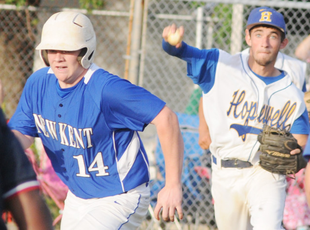 New Kent third baseman Quentin Schaffer tags Hopewell's Travis Hogan on a pickoff attempt at third, but Hogan beat the tag.