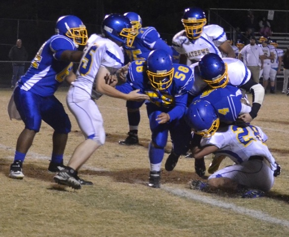 Panther running back Mason Jefferson (4) braces for impact from Mathews' Cody Correll as teammates Hunter Jones (58) and Benjamin Benford (64) provides additional blocking and protection.Andre' Jones photo