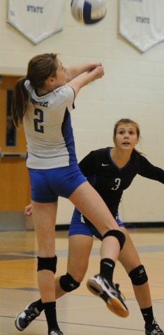 Lady Trojan Jada Evans (2) leaps to save an errant pass as teammate Alyssa Krause moves into position to assist.Alan Chamberlain photo
