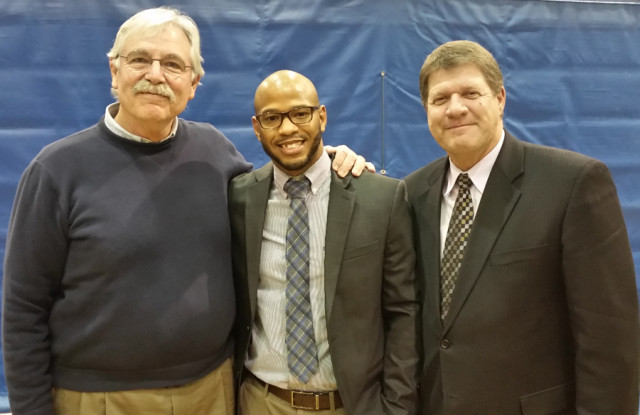 George Jones (center), a former standout running back for New Kent High School who continued his playing career at Christopher Newport University, was inducted into CNU's Hall of Fame during a Feb. 7 ceremony. He is flanked by his high school coach, Fred Birchett (left), and college coach, Matt Kelchner. Jones helped lead New Kent to the state Group AA football final in 2002. At CNU, he was voted USA South Offensive Rookie of the Year as a wide receiver his freshman year. He went on to become CNU's all-time leader in career catches with 132 and a two-time first team all-conference wide receiver. His 1,830 career receiving yards rank third all-time while his 3,154 all-purpose yards are fourth. He scored 29 touchdowns, sixth all-time at CNU. Jones and four other former CNU athletes were inducted into the hall that now has 118 members.Photo courtesy of Fred Birchett