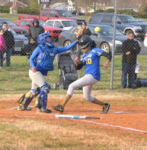 Charles City catcher Sydney Richard is able to snag a throw for an out just before Surry's Alexis Holloway crosses the plate.Andre' Jones photo